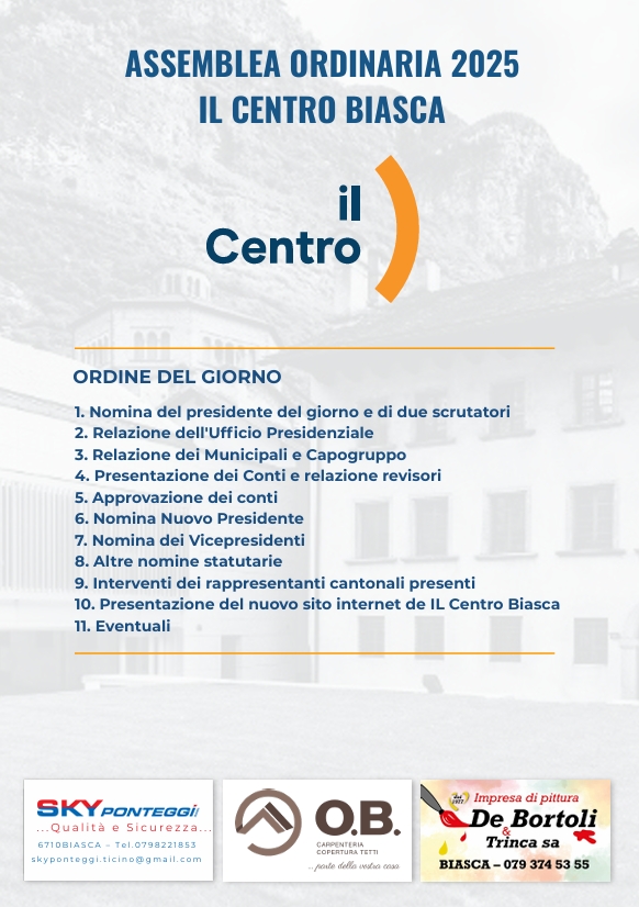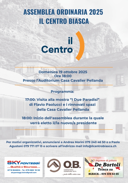 La sezione del Centro di Biasca organizza l’Assemblea per domenica 19 ottobre alle 18.00 nell’Auditorium Casa Cavalier Pellanda (nuovo Centro Culturale) a Biasca.