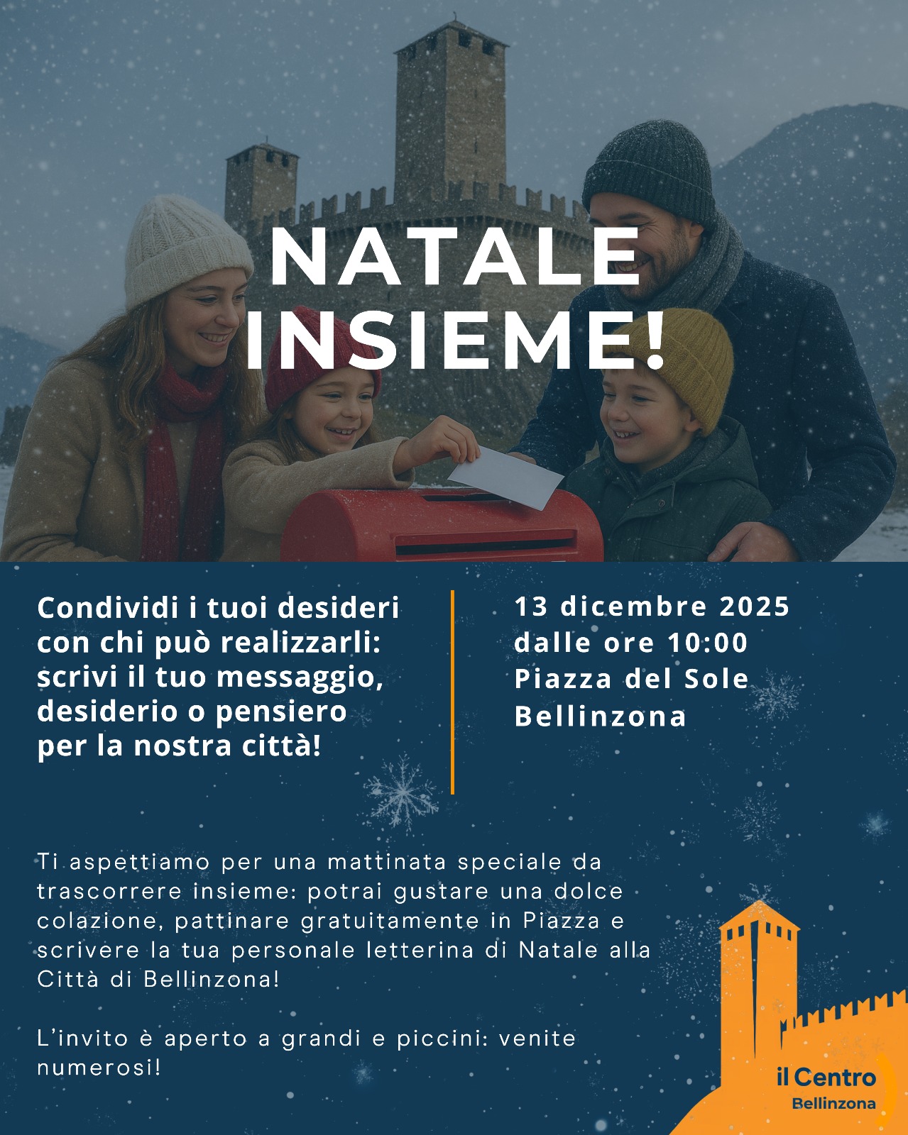 - Postazione “Lettera a Bellinzona”: grandi e piccini potranno scrivere un messaggio, un desiderio o un pensiero per la città