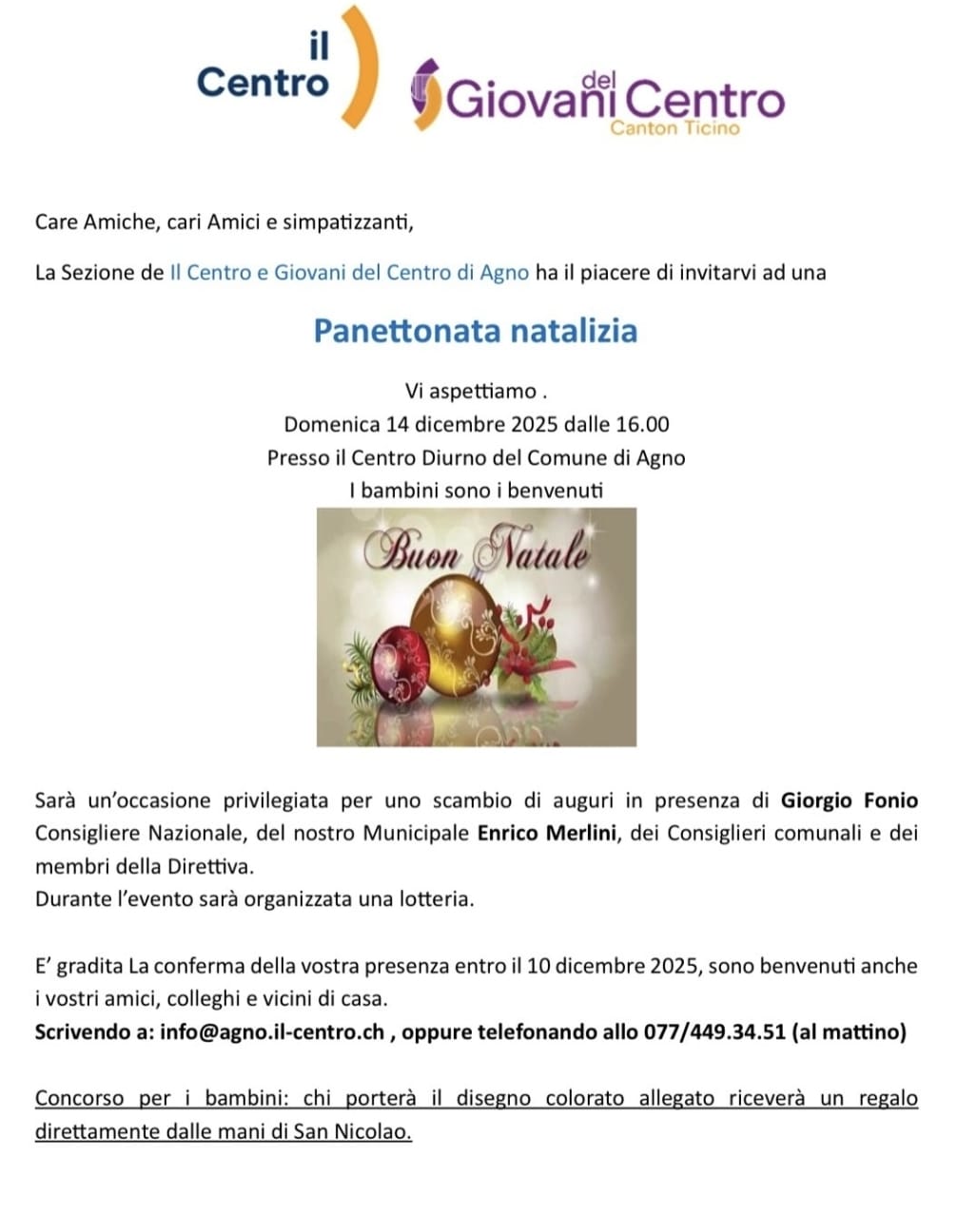 La sezione di Agno e i Giovani del Centro organizzano una panettonata natalizia per domenica 14 dicembre dalle 16.00 al Centro Diurno di Agno.