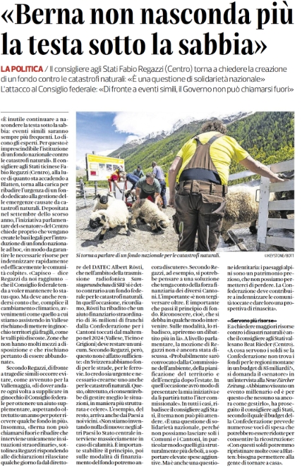 Il consigliere agli Stati del Centro Fabio Regazzi ribadisce l’urgenza di un fondo nazionale per le catastrofi naturali, un’iniziativa depositata nel settembre 2024, che chiede di creare le basi legali per l’introduzione di un fondo nazionale che permetta di indennizzare e garantire le risorse necessarie alle comunità colpite.