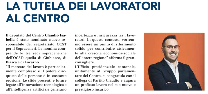 Il deputato del Centro Claudio Isabella è stato nominato nuovo responsabile del segretariato OCST per il Sopraceneri. La nomina comprende le tre sedi sopracenerine dell’OCST: quella di Giubiasco, di Biasca e di Locarno.
