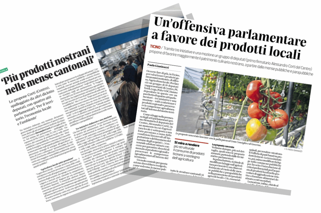 Il deputato del Centro Alessandro Corti ha depositato quattro atti parlamentari, che chiedono di incentivare il consumo di prodotti locali nelle mense pubbliche e parapubbliche. Ciò permetterebbe di “valorizzare il territorio, rafforzare l’economia locale e favorire maggiore sostenibilità ambientale, senza entrare in contrasto con le disposizioni federali sugli appalti pubblici”.