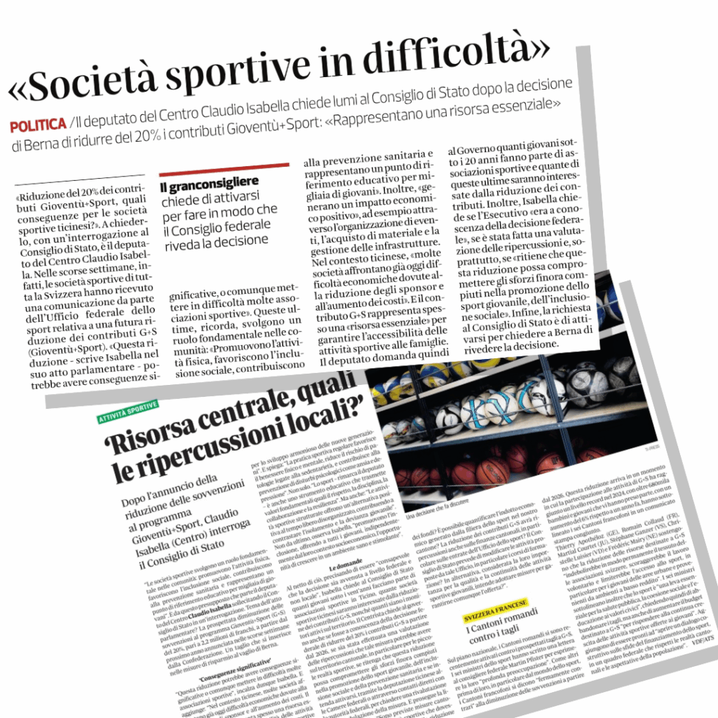 Il deputato del Centro Claudio Isabella, in un’interrogazione al Governo, ha chiesto spiegazioni sulla decisione dell’Ufficio federale dello sport di ridurre del 20% i contributi Gioventù+Sport. Un sostegno fondamentale per molte associazioni sportive, la cui riduzione rischia di metterne in difficoltà l’attività, nonché di limitare l’accesso allo sport a molte famiglie.