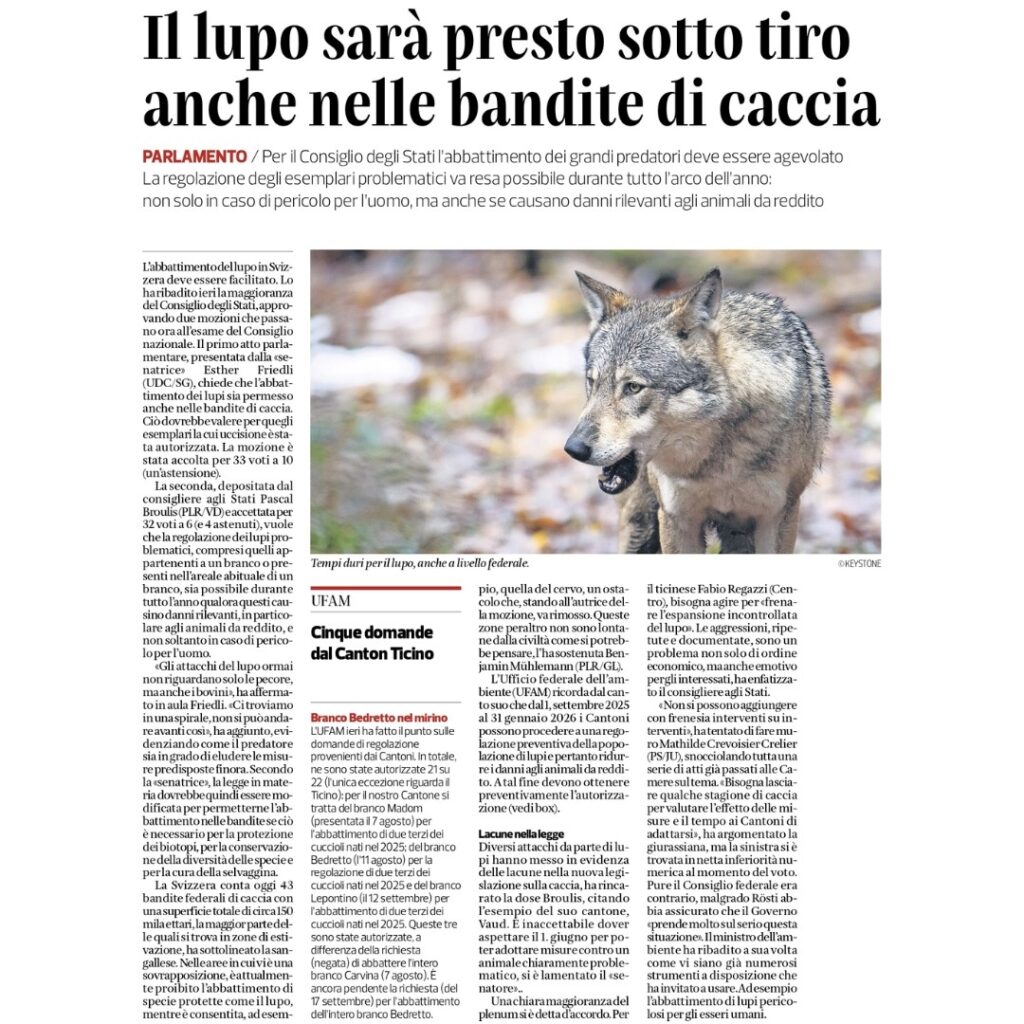 Il Consigliere agli Stati del Centro Fabio Regazzi commenta la notizia, sottolineando l’importanza di frenare quella che è diventata “un’espansione incontrollata del lupo”.